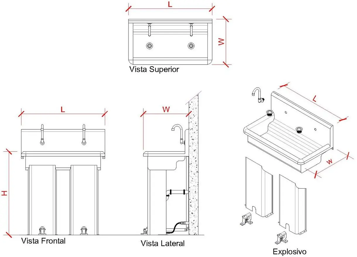 Lavamanos de pedestal fabricado en acero inoxidable. Incluye llave de pedal, grifo, canasta retenedora de solidos y conexion interior en CPVC. NO incluye manguera(s) de abasto, instalacion ni trabajos de plomería.